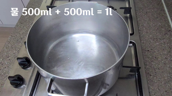 우선 큰냄비를 준비하고 물을 1리터 정도 부어 주세요.